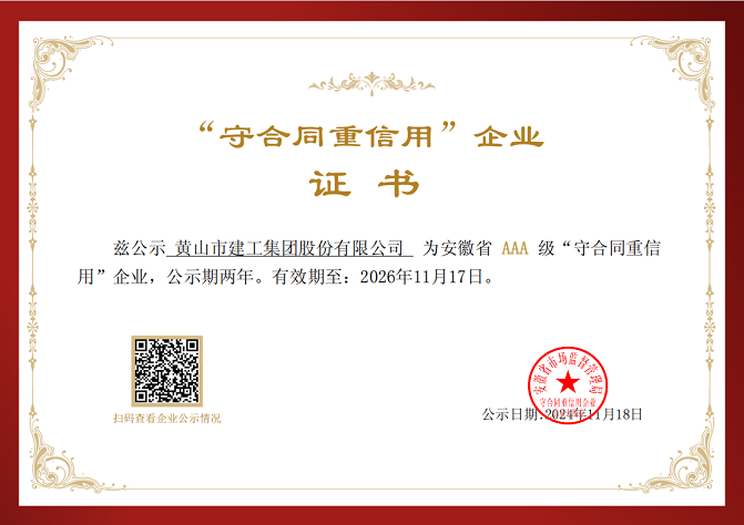 近日,黃山建工集團憑借健全的信用管理體系、優(yōu)良的合同履約信用狀況和良好的市場信譽榮獲安徽省AAA級“守合同重信用”企業(yè)稱號。這一榮譽的獲得,不僅是對黃山建工集團在企業(yè)經(jīng)營過程中始終堅持誠信經(jīng)營的肯定,也是對黃山建工集團在合同履行和信用管理方面所取得的顯著成績的認可。